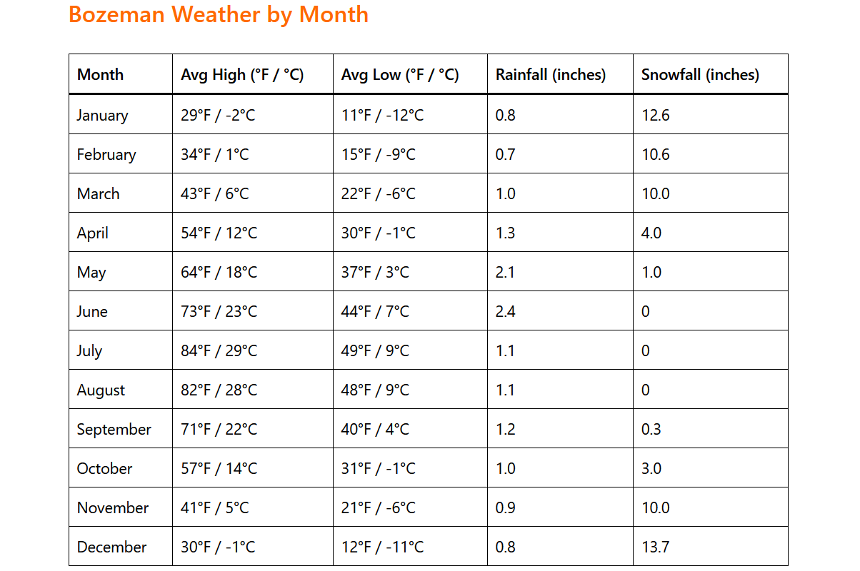 Below is a month-by-month guide to Bozeman’s weather, including temperature trends, snowfall, and what you can expect throughout the year.