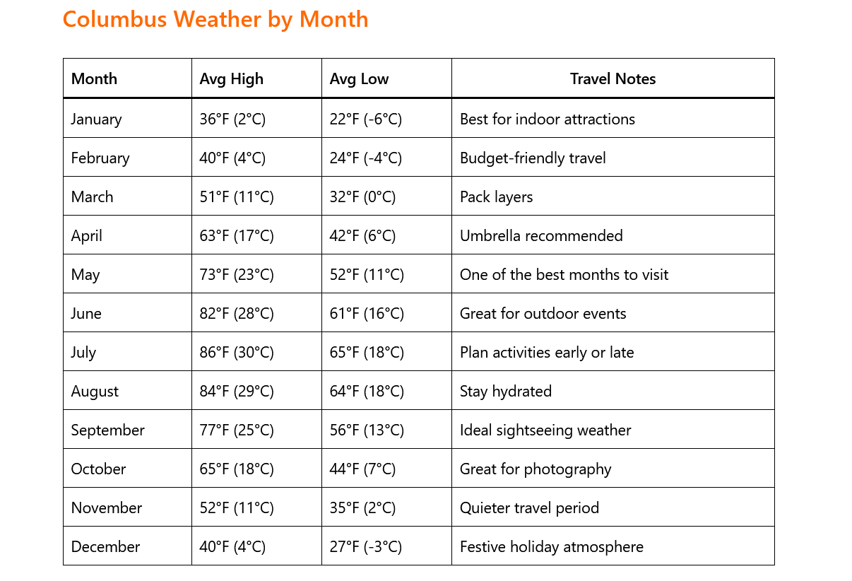 Understanding Columbus weather by month allows travelers to choose the ideal time for their interests—whether that’s enjoying summer festivals, admiring fall foliage, or experiencing a cozy winter getaway. With the right planning and packing, Columbus can be an enjoyable destination any time of year.