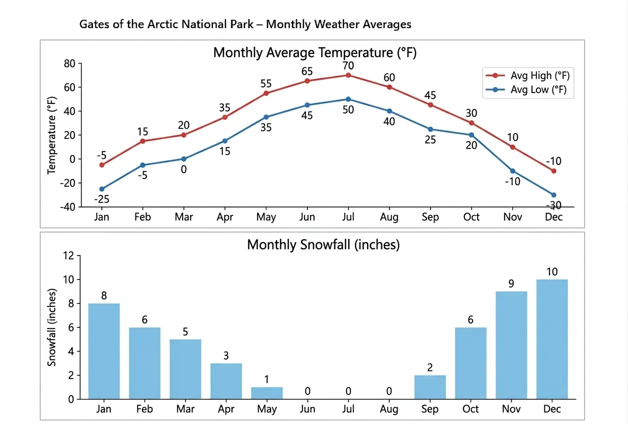 Because Gates of the Arctic is so remote, these numbers are generalized from nearby Arctic Alaska climate data rather than a single fixed station.