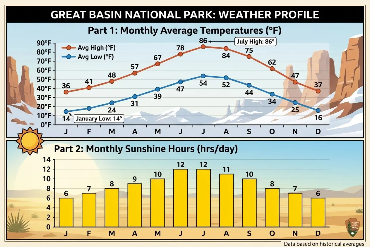 Great Basin National Park is known for its dramatic elevation changes—from desert valleys to the 13,063-foot summit of Wheeler Peak—which create highly variable weather throughout the year. Understanding the park’s monthly climate helps visitors plan everything from scenic drives to high-altitude hikes.