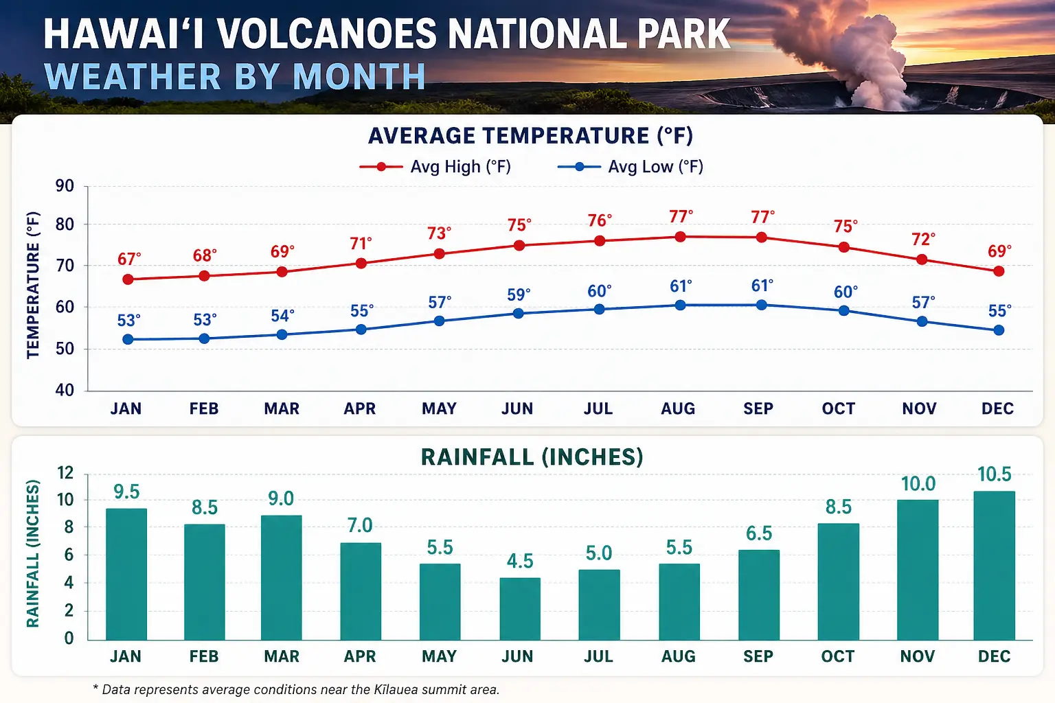 • Snowfall: Essentially zero at park visitor areas. Snow only occurs on very high peaks like Mauna Loa or Mauna Kea, which are outside typical park visits.