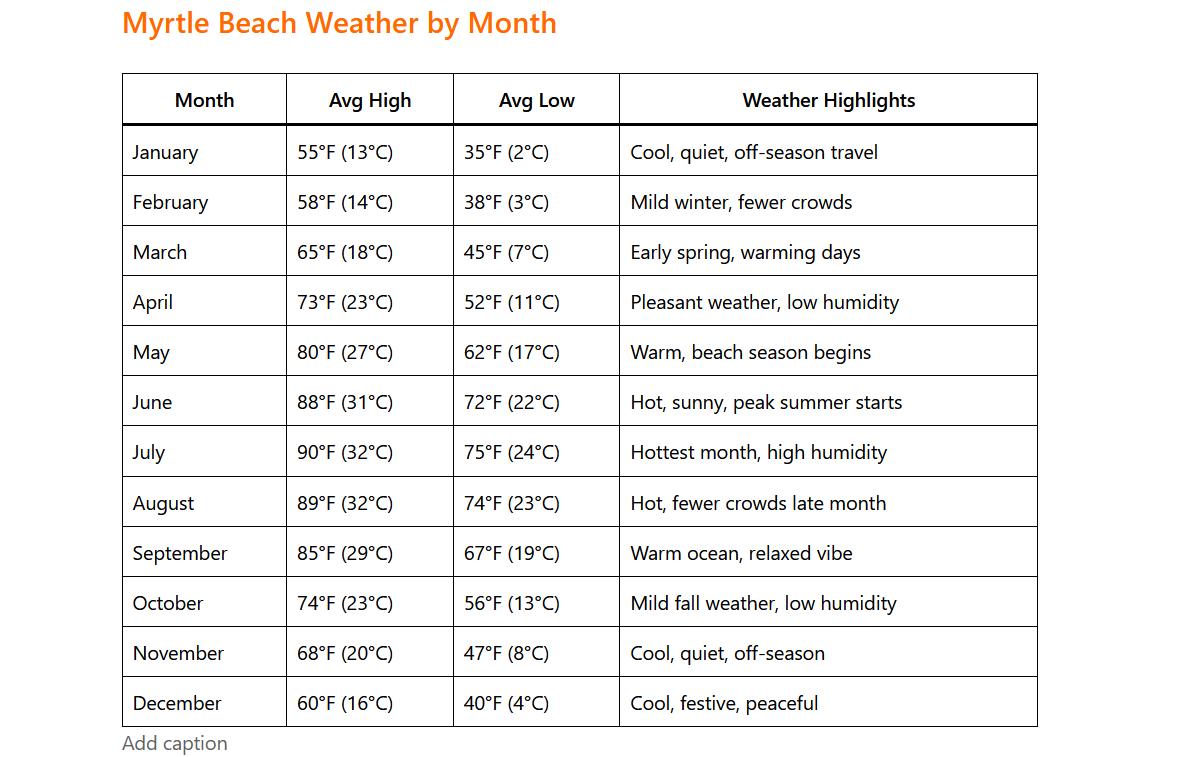 Understanding Myrtle Beach weather by month helps you plan the perfect trip—whether you want a sunny beach vacation, a quiet getaway, or a budget-friendly escape. Each season offers its own charm, so the best time to visit depends on your travel style and priorities.