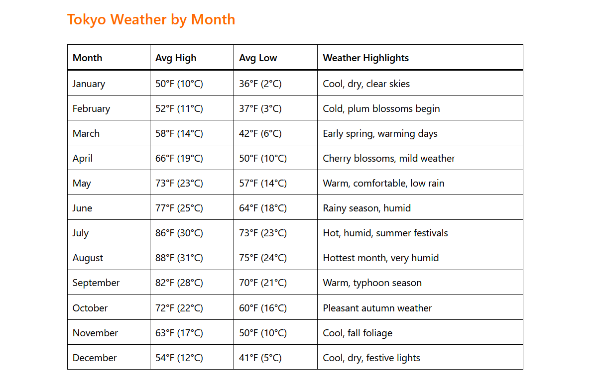 Understanding Tokyo weather by month allows travelers to plan smarter and enjoy the city more comfortably. Whether you’re visiting for cherry blossoms, summer festivals, autumn foliage, or winter illuminations, Tokyo offers a memorable experience in every season.